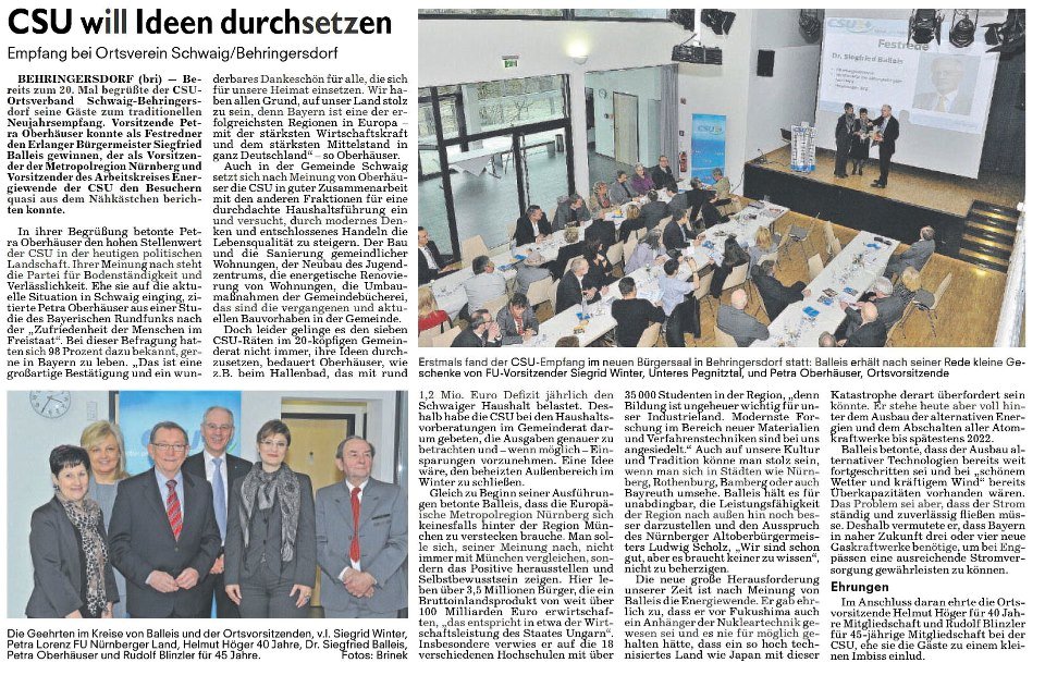 Am diesjährigen Neujahrsempfang der CSU nimmt Bayerns Ministerpräsident Horst Seehofer teil und sagt dabei auch seinen Besuch zur diesjährigen Bergkirchweih zu. Der Empfang findet am 6.1.2013 in der Heinrich-Lades-Halle statt.