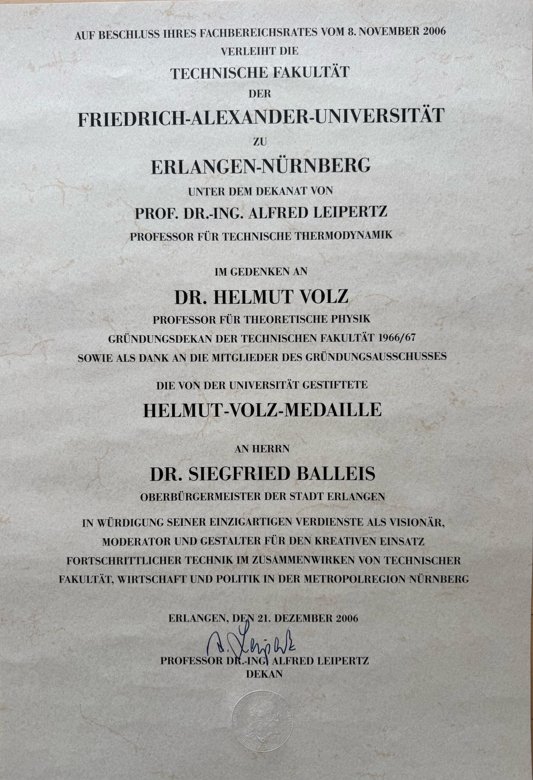 Verleihung der Helmut-Volz-Medaille der Technischen Fakultät der Friedrich-Alexander-Universität Erlangen-Nürnberg am 21. Dezember 2006